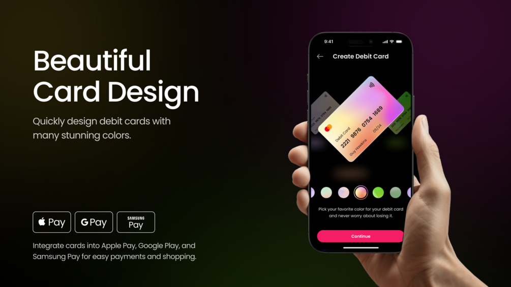 • Creation of Debit and Credit Cards, seamlessly integrated with Apple Pay, Google Pay, and Samsung Pay for convenient payments